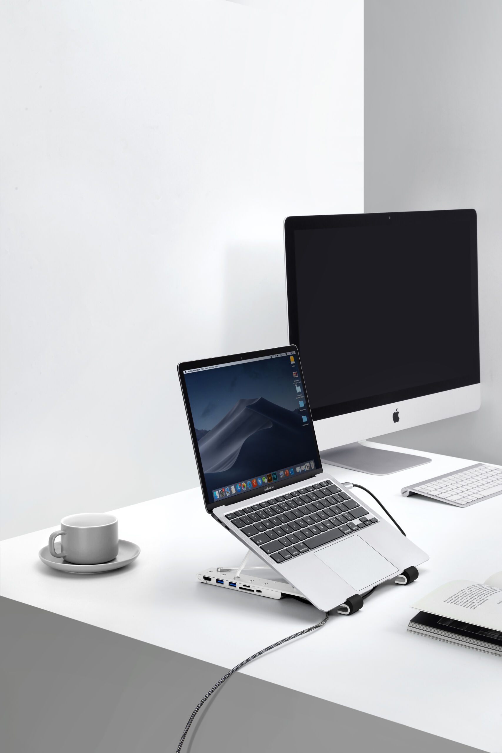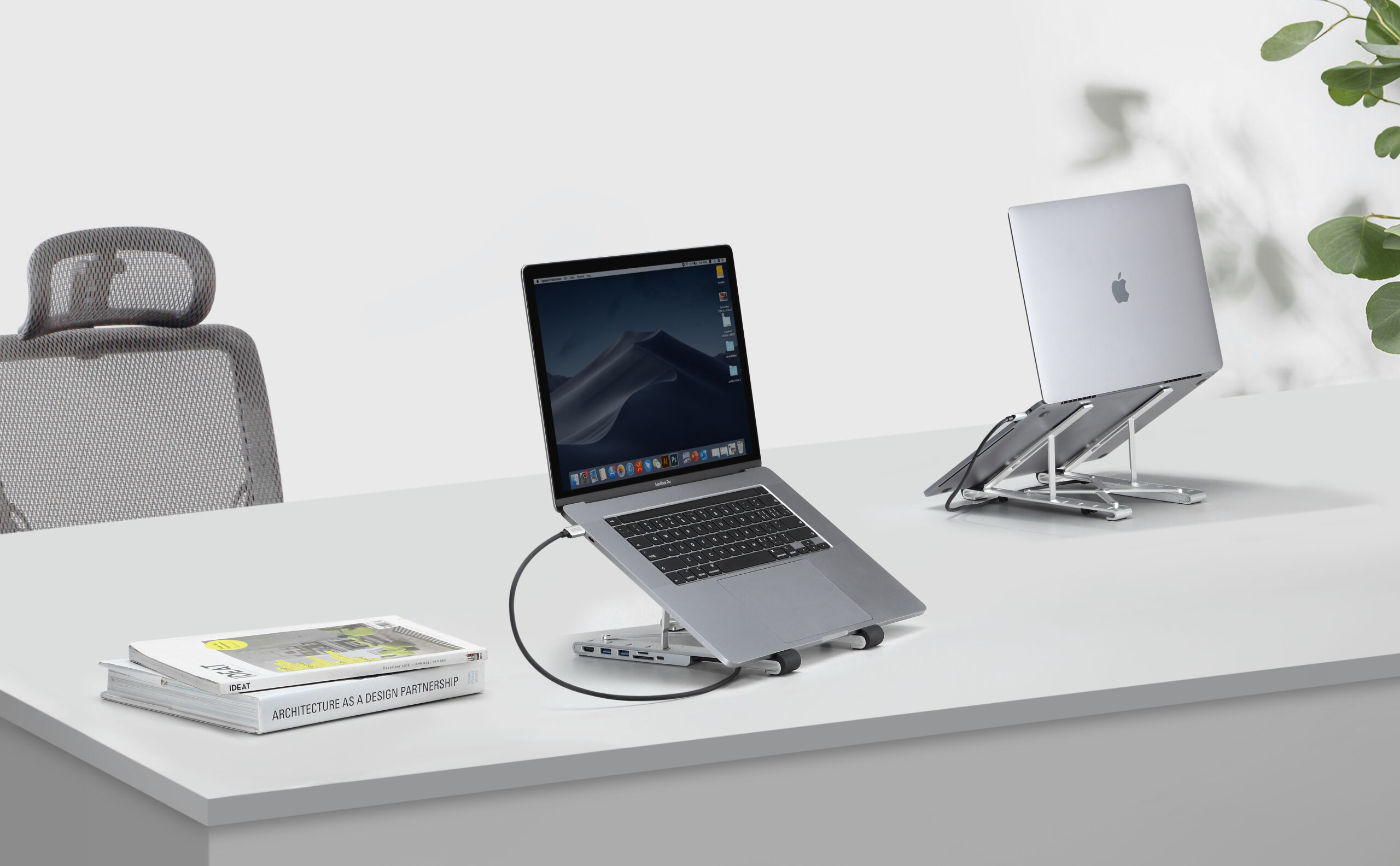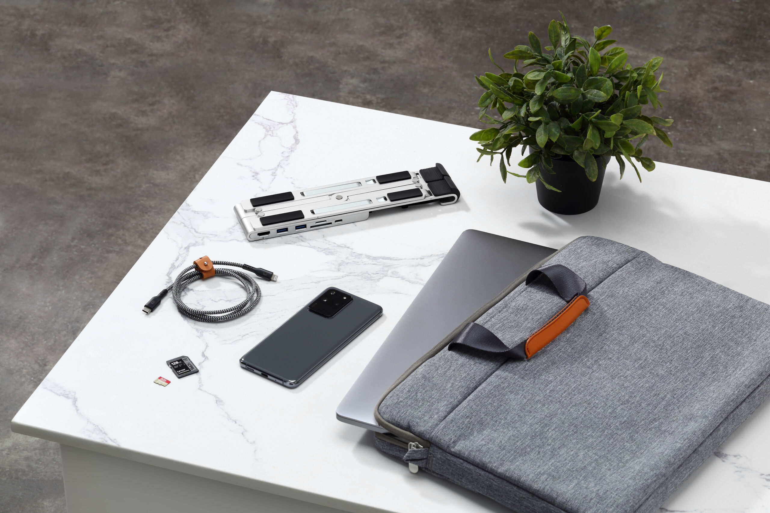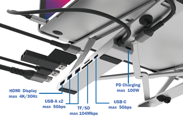 出先でも最適な姿勢と、7つの機能のハブをすぐに使うことができます。もうスタンドと一緒に変換コネクタ達の入ったポーチを持ち運ぶ必要はありません。