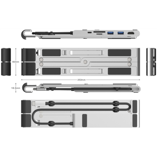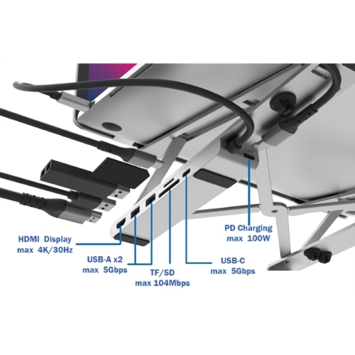 出先でも最適な姿勢と、7つの機能のハブをすぐに使うことができます。もうスタンドと一緒に変換コネクタ達の入ったポーチを持ち運ぶ必要はありません。